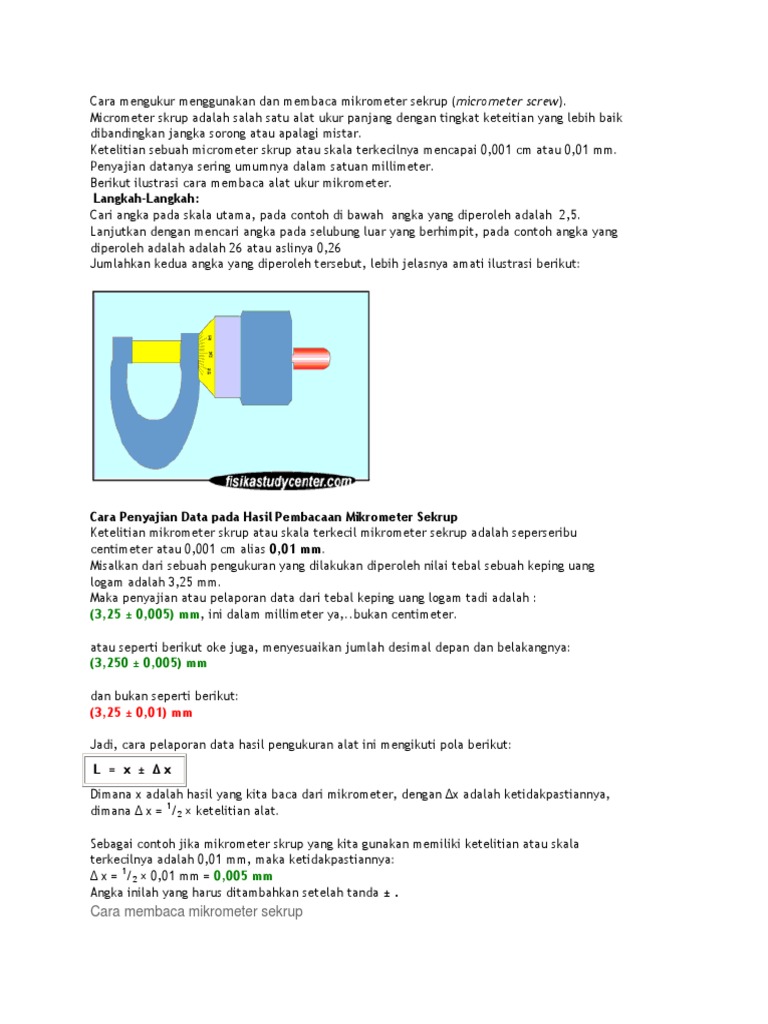 Artikel yang menjelaskan secara lengkap tentang mikrometer sekrup, cara membaca, cara menggunakan dan contoh soal mikrometer sekrup. Jangka sorong adalah alat ukur yang di gunakan untuk mengukur panjang dan ketebalan suatu benda dengan tingkat ketelitian hingga 0,1 mm. Dua buah pelat besi diukur dengan menggunakan jangka more from my site. Gambar di bawah ini menunjukan pengukuran lebar balok menggunakan jangka sorong. Contoh soal mikrometer sekrup dan pembahasannya.